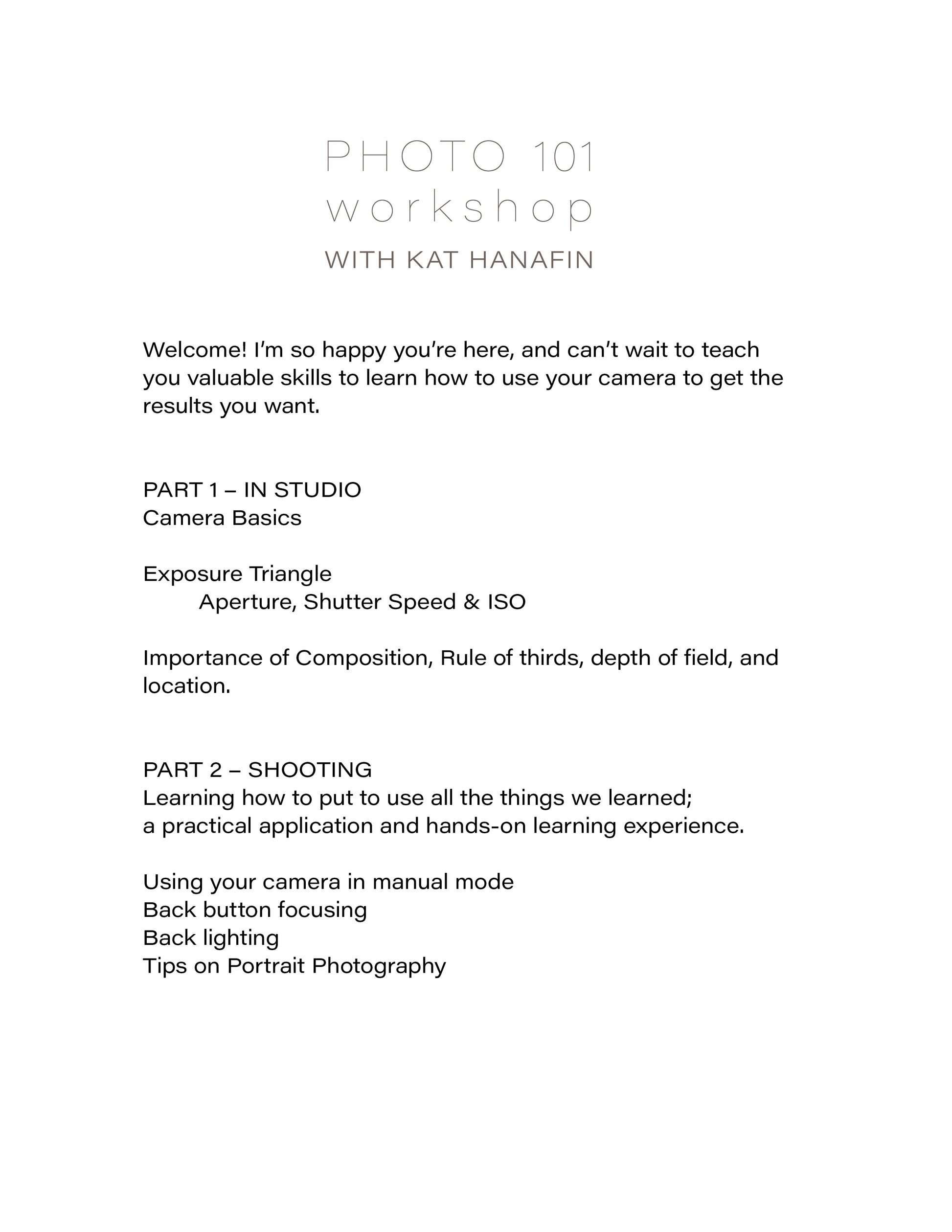 (Table of contents provided for beginner learners; we can make it more advanced if the learner is already comfortable with their camera on manual. The one-on-one nature of the class makes it a completely custom experience for the attendee.)